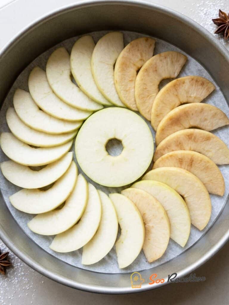 - Placez le haut de pomme, la tige vers le bas, au milieu du moule et recouvrir le reste des tranches de pommes tous autour.