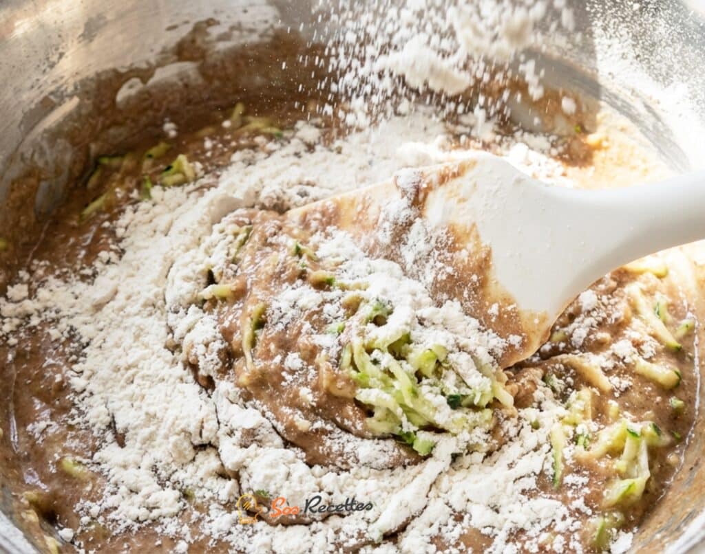 7) Mélanger la farine avec le bicarbonate de soude, et ajouter à la première préparation.