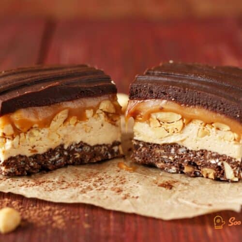 Carrés chocolat caramel croustillants empilés avec plusieurs couches biscuit, caramel et chocolat
