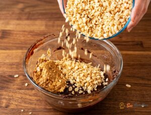 • Ajouter la moitié du beurre d’arachide (quantité indiquée total) au chocolat fondu. Verser toutes les céréales de riz croustillant et mélanger jusqu’à ce que chaque grain soit bien enrobé.